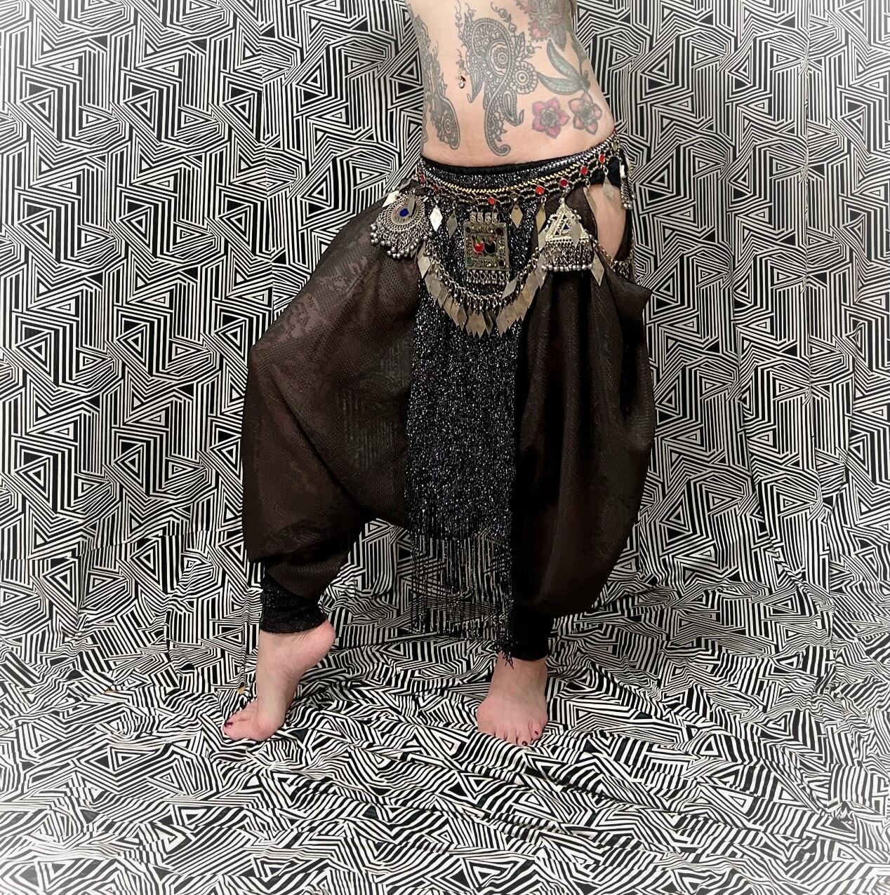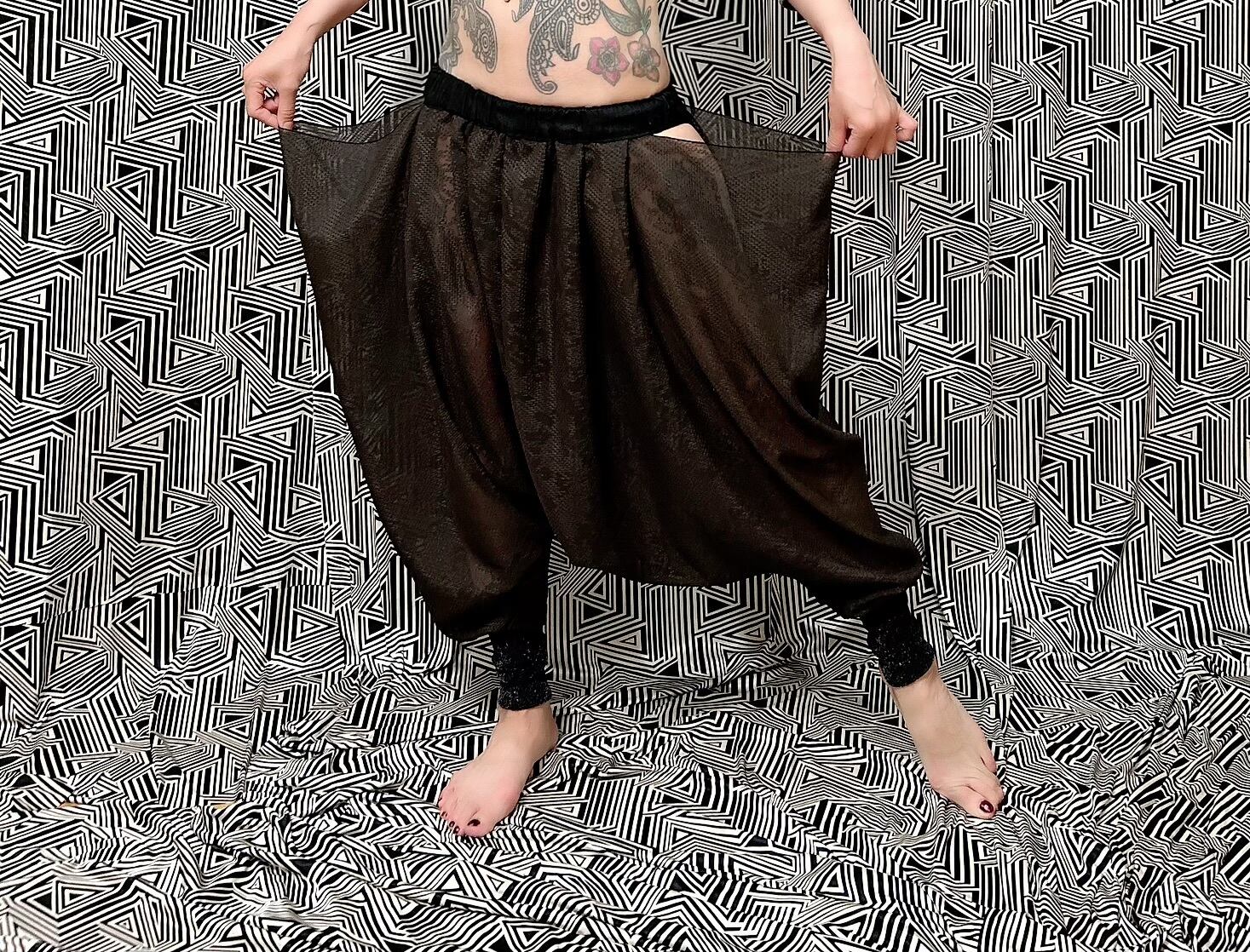 サイド開きで肌がチラッと見えるサルエルパンツ。