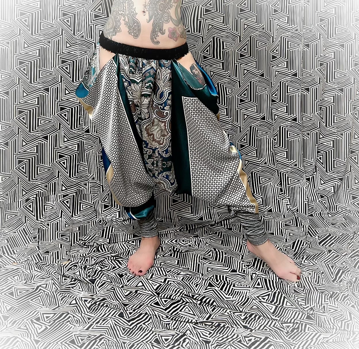 サイド開きで太ももがチラッと見えるサルエルパンツ。